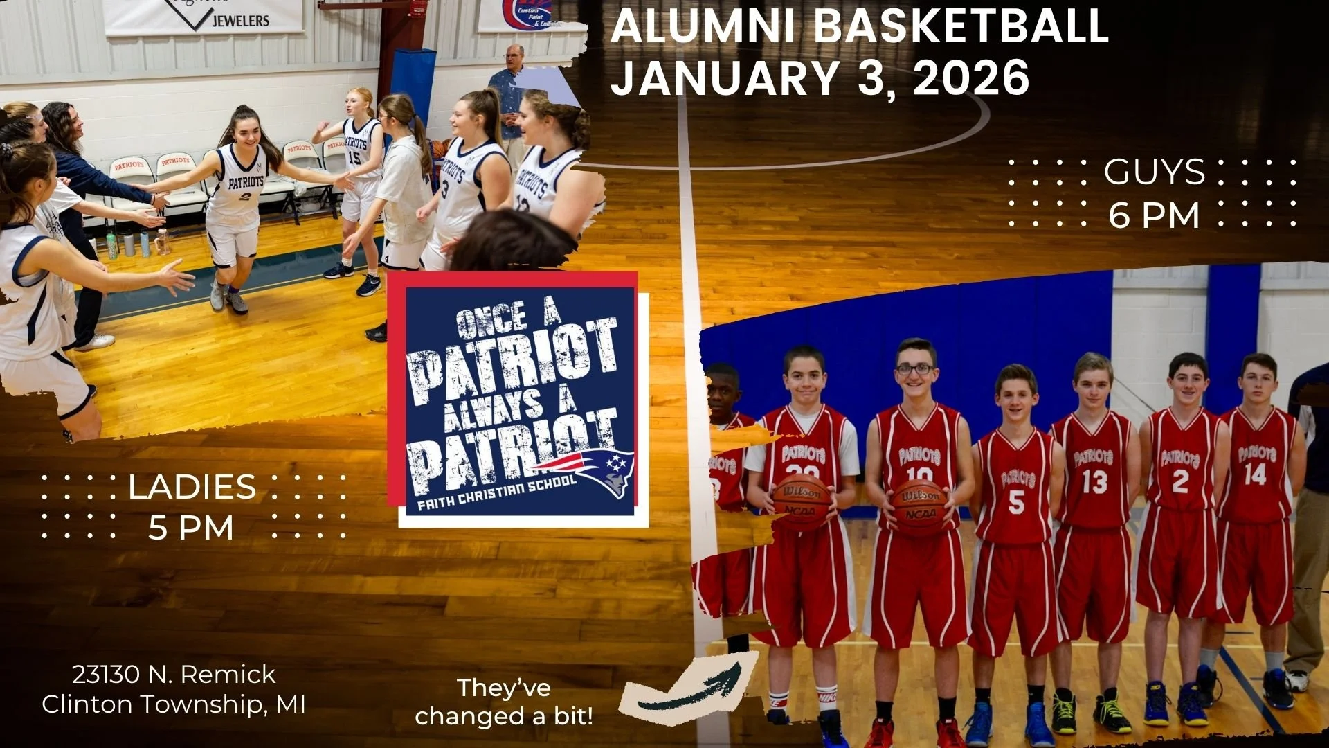 ALUMNI Basketball 2025 Saturday, January 3, 2026 5:00 PM 7:00 PM Faith Christian School 23130 North Remick Drive MI, 48036 United States (map) Google Calendar ICS Click here to let us know you are coming!