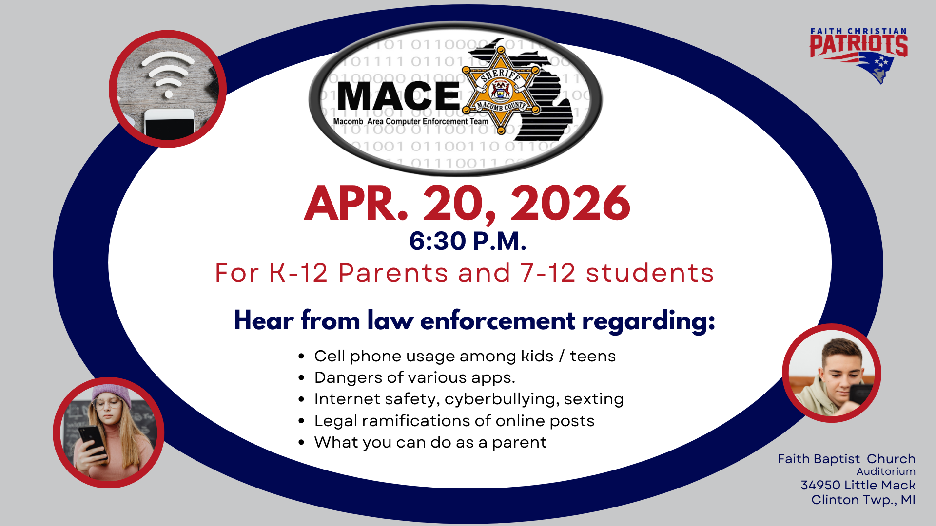 MACE Presentation Monday, April 20, 2026 6:30 PM 8:00 PM Faith Baptist Church 34950 Little Mack Avenue Clinton Township, MI, 48035 United States (map) Google Calendar ICS