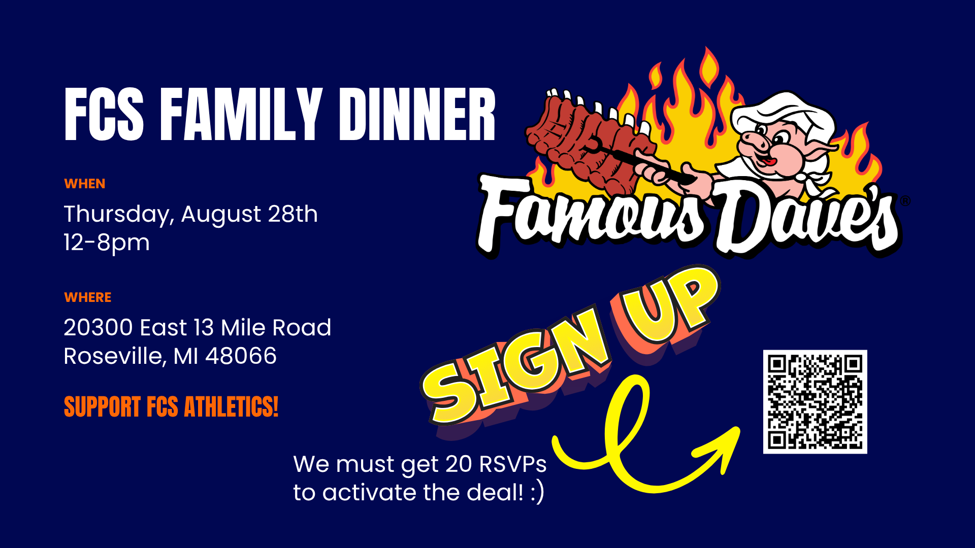 FCS Family Dinner night Thursday, August 28, 2025 12:00 PM 8:00 PM Famous Daves 20300 13 Mile Road Roseville, MI, 48066 United States (map) Google Calendar ICS RSVP Here!