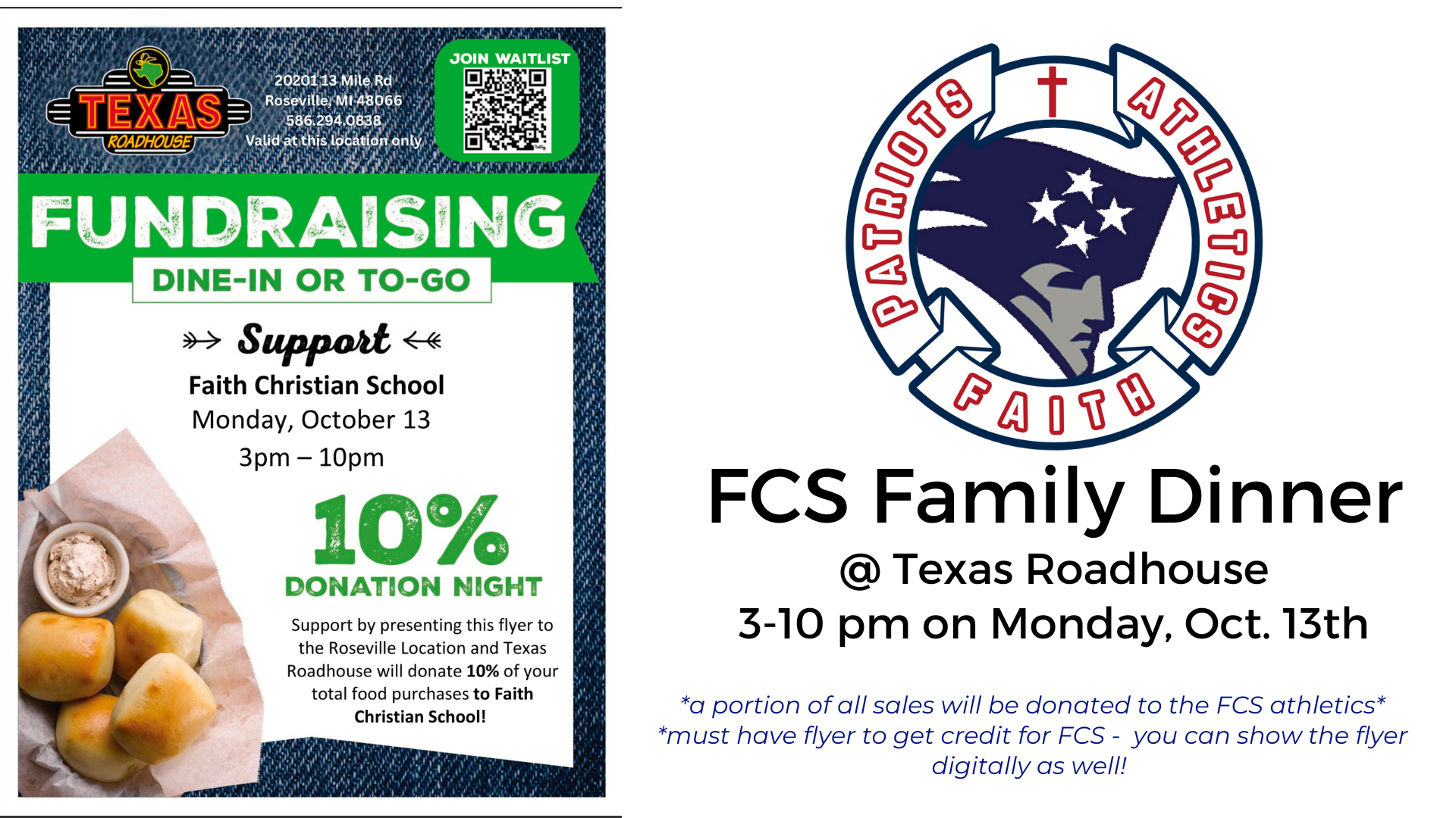 FCS Family Dinner night Thursday, October 2, 2025 3:00 PM 10:00 PM Texas Roadhouse 20201 13 Mile Road Roseville, MI, 48066 United States (map) Google Calendar ICS Click for Flyer